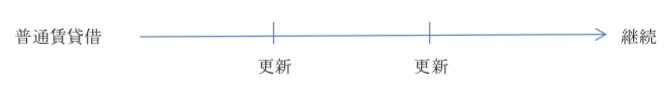 具体的なイメージは次の通りです。普通賃貸借契約は継続する契約です。更新はありますが、基本はずっと継続です。そのために「出て行って」というためには、どこかで契約を解除(解約)しないといけません。